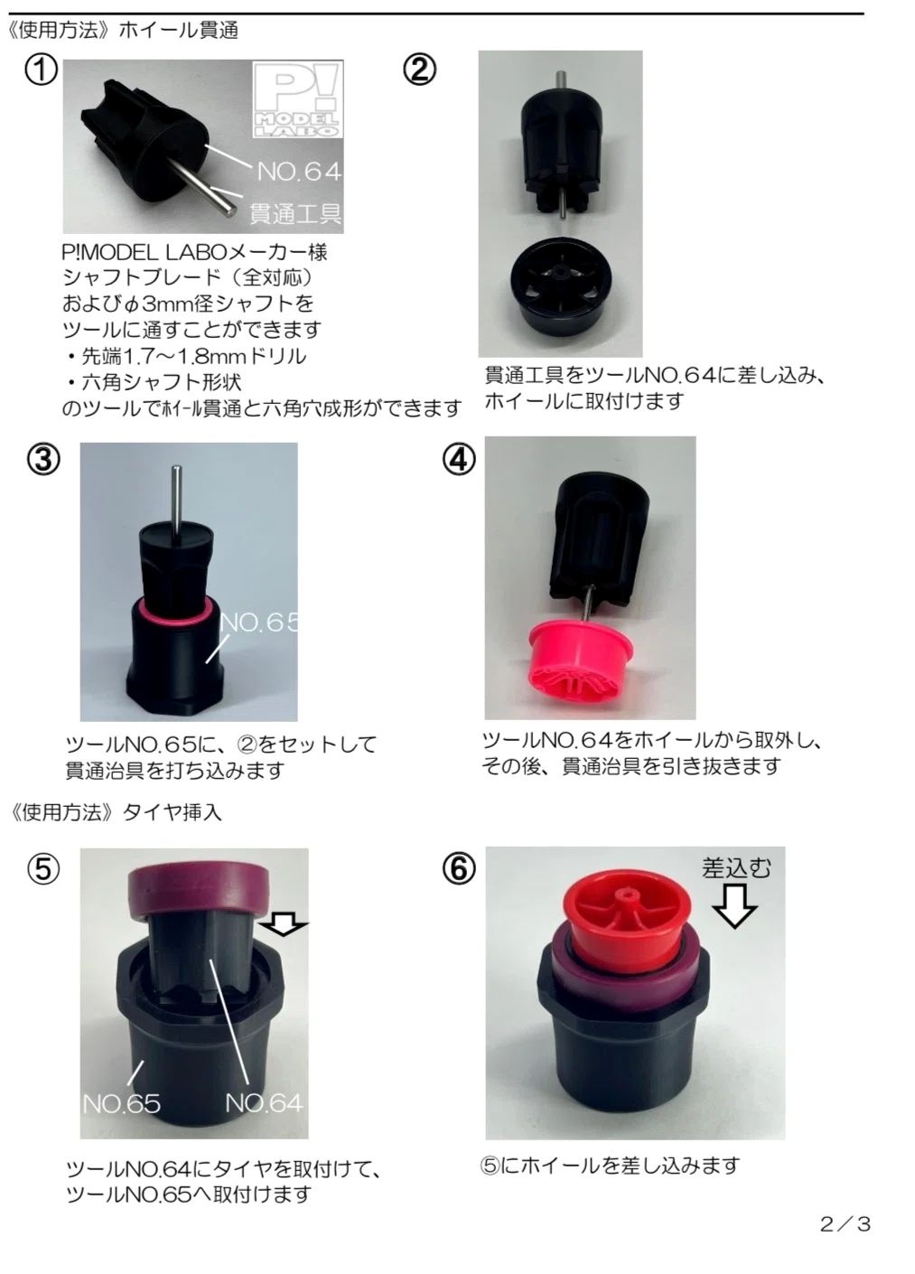《タイヤホイール製作 便利ツール》 ⚫ホイール貫通 ⚫タイヤ挿入(接着) 2つの作業を本ツールで行えます 【従来のNO.04,05ツールから、対応するホイールを増やし、小径タイヤを中径ホイールに取り付けることが出来ますので、より幅広いセッティングが可能になります。】 ◎追加機能 ・Yスポークおよび12スポークホイール対応 ツール取扱い説明書にホイール対応表を掲載して おりますのでご確認ください。 ※PP、カーボン材質ともに使用できます。 ・小径タイヤを拡張し、ホイールは挿入できます。 ・別出品のツール《NO.01およびNO.02》に対応し、より作業が楽になります 【商品紹介】 <ホイール貫通&タイヤ接着ツール> ・加工作業を補助しお手持ちの治具を 打ち込み、および抜き取り時に損傷させ にくい作りにしています <内容物> ・ホイール貫通&タイヤ接着ツール 製品番号:NO.64,65 各 1個 ※中径ローハイトホイール用 <用途> ・ツール NO.64 ホイール貫通ガイド&タイヤ挿入時の拡張用と して使用します。 貫通時、【P!MODEL LABO】メーカー様 製品のシャフトブレード(P11、P23、P31、 P32)全てに対応しています ・ツール NO.65 ホイール貫通の打ち込み土台&タイヤ挿入時の タイヤ保持台として使用します。 ツールの裏表面を使い分けて、2つの作業が可能です。