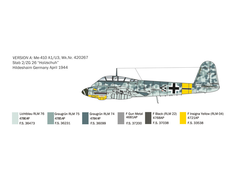 1939年からドイツのメッサーシュミット社で開発されていた戦闘機「Me-210」の発展型として、1943年から配備が開始された「Me 410」をモデル化したプラスチックモデル組み立てキットです。双発エンジンと2名乗員のコクピット、胴体側面中央に13mm機銃を備えたスタイルを再現。4種類のマーキングが付属するスライドマークはカルトグラフ社製。全長172mm。