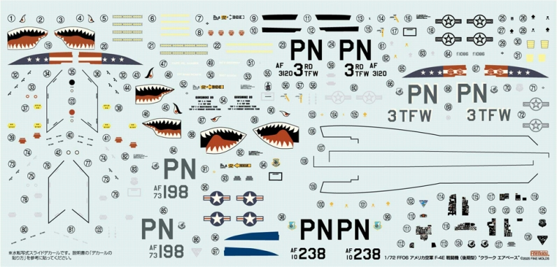 付属デカールはベトナム戦後フィリピンクラーク基地に展開したアメリカ太平洋空軍所属の第3戦術飛行団(3TFW)のマーキングになります。隷下の第3戦闘飛行隊(3TFS)は、ベトナムとソ連をけん制する目的で長く南シナ海周辺の安定に寄与しました。ロングノーズにシャークティースを描き込んだF-4Eは、横田基地や嘉手納基地に頻繁に飛来しており日本でも馴染みのある部隊です。パッケージイラストは1984年頃のクラーク基地エプロンでの情景としました。