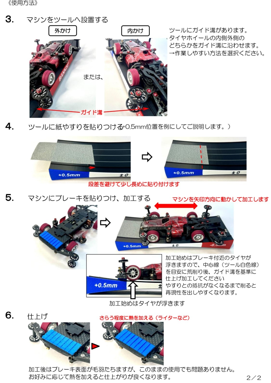 ご覧いただきありがとうございます。 【ご案内】 こちらは、各種単品販売ページになります。 バンク20°とバンク30°の2 種類セットでの購入はお安くお買い求めいただけますので、 当ショップの商品一覧よりご確認ください。 ●各種単品 ◀️このページ ●2種類セット 【セット品】 3レーンセクション用 ブレーキメーカー 《NO.119,120》 【商品紹介】 《3レーンセクション用 ブレーキメーカー》 ブレーキスポンジをバンク形状に限りなく近づけられるようにできるツールです。 ・前後のブレーキスポンジ製作において、やすり でスポンジを削っていく加工になります ・20°バンクセクション形状をベースにタイヤ ホイールをガイドにして加工できるようにして いるため、マシン個々にあわせてブレーキを きれいに正確に仕上げることができます ・加工面は、20°バンク面にたいして、 +0.5mm、±0mm、-0.5mmの段差3パターン を設定しており、使用するやすり厚さや、 マシンタイヤホイール径、接着テープの 貼り増しの工夫で細かくブレーキ高さを 調整できるようになっています ・チューンマシン、オープンマシンやストックク ラスなどの幅広いマシンのブレーキ製作が 簡単になります ・右利き、左利き兼用仕様 <内容物> ・ブレーキ加工ツール本体 《NO.119またはNo.120》 1個 計 1点 <仕様> ・本体 材質 : ABS樹脂 <表示価格> ・一般販売価格1,350円(税抜)に 10%消費税を加算しております。 【注意事項】 <発送について> ・3Dプリント製法による、面のざらつきや 小キズがつきますが品質検査を実施の上、 使用と機能に問題ない状態で出荷させて いただいております。 製品到着時の初期不良や使用時のトラブルによる 早期破損などございましたら、取引メッセージ内 にて無償対応させていただきます。 <その他> ・品質向上のため予告なく仕様変更をする場合が ございますので、ご了承ください。 ・スムーズで気持ちの良い取引を心がけて、 対応させていただきます。 よろしくお願いします。 セイCHAN@クラフト&カスタマイジング #ミニ四駆 #Craft&Customizing #加工ツール #3レーン #ブレーキ加工ツール #ブレーキ #バンクセクション #20°バンク #30°バンク
