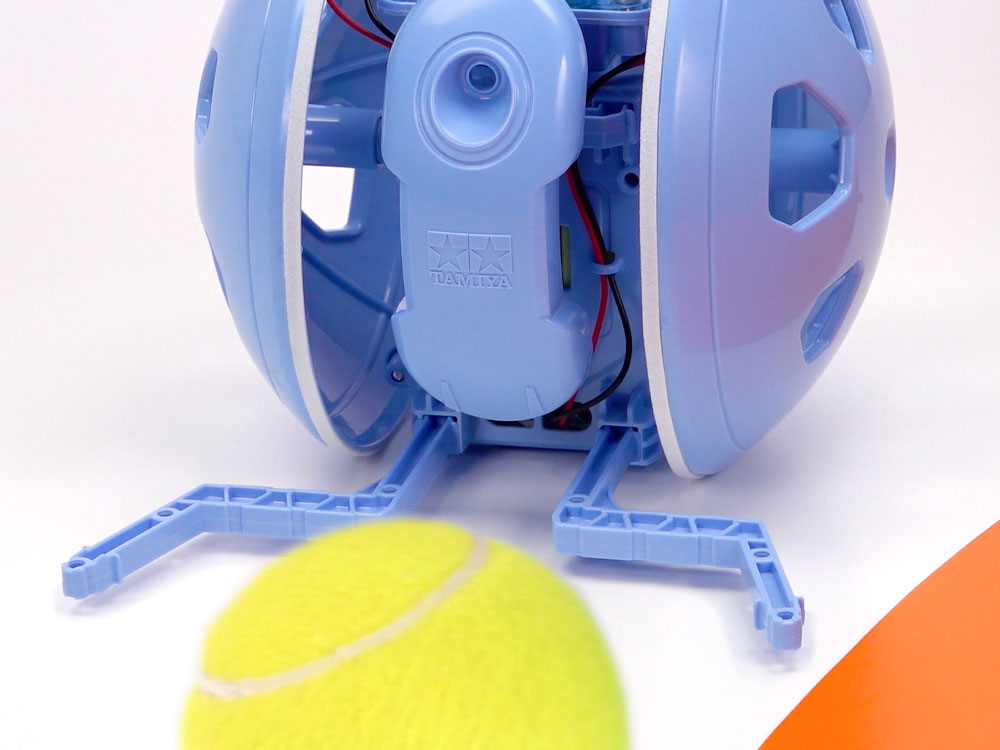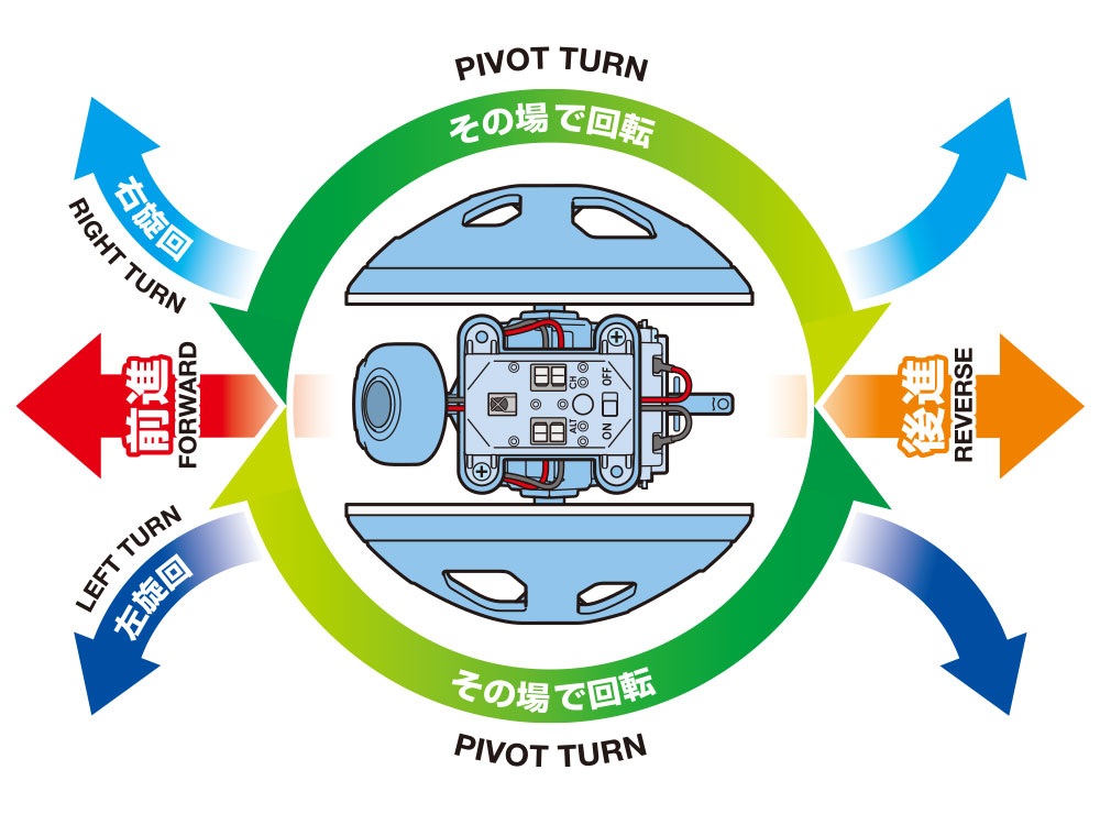 【 コミカルで楽しい動きを赤外線で自由にコントロール 】 半球形の大きなホイールを回転させて移動する球体型ロボットの工作セットです。ロボット本体にはモーターを内蔵した2つのギヤボックスと赤外線受信ユニットを搭載。キットの赤外線リモコンを使って左右ホイールの動きを制御し、前後進や左右旋回、その場でくるりと回転もできます。ホイールの回転速度はリモコンで16段階に調整可能。はめ込みとビス止めで完成する組み立てやすさもポイントです。ロボットに取りつけて遊びの幅を広げるアームも用意しました。
