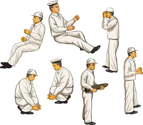 直立、敬礼、歩行、高角砲・機銃の操作、双眼鏡を覗く姿、弾薬を運搬する姿など合計11種類のポージングを再現できます。