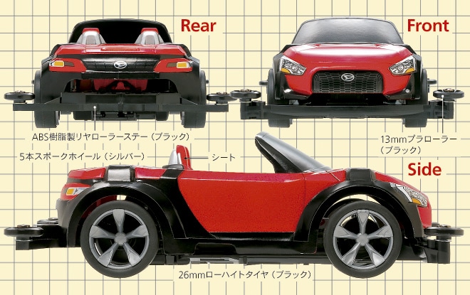 シャフトドライブ四輪駆動を採用した高性能レーサーのプラスチックモデル組み立てキットです。ダイハツ コペンXMZは、ダイハツ工業が2013年の東京モーターショーに出品した2人乗り軽オープンのコンセプトカー。ボディはオープン状態をモデル化し、運転席や助手席なども立体的な仕上がり。ヘッドライトやテールライト、フロントグリルのエンブレム、特徴的な造形の前後フェンダー部分などはステッカーで表現しました。シャーシは剛性・拡張性が高いスーパーII。ターン式スイッチや2点固定式リヤステー、ビス止め式のリヤギヤカバーなど注目装備を満載しました。また、シルバーカラーの5本スポークホイールに、直径26mmのローハイトタイヤを装着。ギヤ比は4:1。モーター付き。組み立ては接着剤不要のはめ込み式。