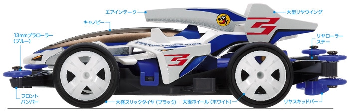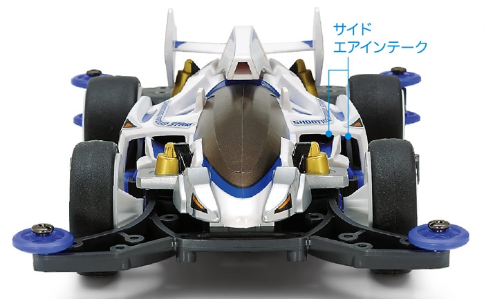 ダブルシャフトモーターを搭載した高性能レーサーのプラスチックモデル組み立てキットです。シューティングプラウドスターは、小学館の「コロコロアニキ」に連載中の漫画「ハイパーダッシュ!四駆郎」に登場する南進駆郎の愛車。この漫画の作者であり、このマシンをデザインした武井宏之先生は、実は中学生の頃、ミニ四駆デザインコンテストに応募した作品が入賞し、その作品が進駆郎の愛車、 初代ダッシュ3号シューティングスター となったという経歴を持っています。そのマシンのスタイルをモチーフにして生まれたシューティングプラウドスター。最大の特徴はキャノピー上部にせり出したインパクト十分のエアインテーク。また、サイドのエアインテークやロングキャノピーはいっそうシャープな仕上がり。前後4本のダンパーユニットやウイング後端のブレーキランプなど、細部までこだわった形状が魅力です。シャーシは駆動効率を追求した、ダブルシャフトモーター搭載のMA。ホワイトカラーの大径4本スポークホイールにはスリックタイヤを装着しました。