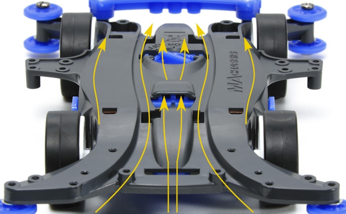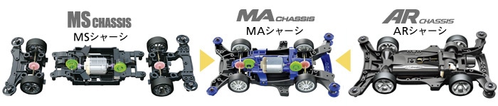 MA とは、Midship AERO(ミドシップエアロ)の略。モーターを車体中央に搭載した、ミドシップレイアウトの「MSシャーシ」、走行中の気流(エアロ)を特に意識してデザインされた「ARシャーシ」。それぞれの優れた特徴を1台のシャーシにまとめあげたのがこの「MAシャーシ」です。もちろん、これまでに蓄積されたレーシングノウハウをいかして、3.5:1のギヤ比を採用、6個の低摩擦ローラーやリヤスキッドバーを標準装備するなど、走行性能も徹底的に磨き上げました。加えて、一体型のモノコック構造の採用で、組み立てやすさやメンテナンス性もさらに向上するなど、初心者からベテランレーサーまで、また、小さめのコースで行われる街かどレースから、大型の特設5レーンサーキットの公認競技会まで、幅広く対応できるシャーシです。