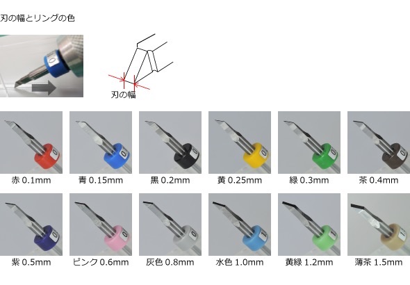 刃の幅は12種類。各サイズごとに色分けしたリングを装着。