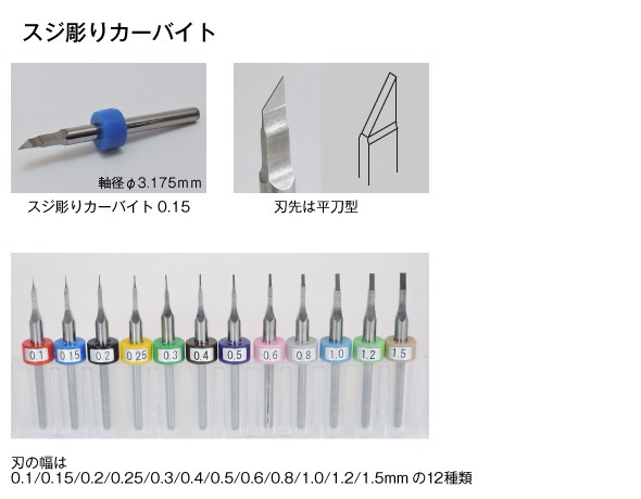曲線のスジ彫りや0.1~0.2mmの細いスジ彫りカーバイトの使用時には特にご注意ください。