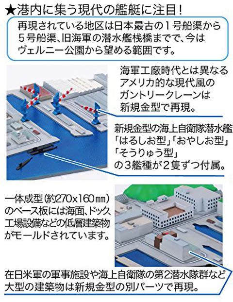 集める軍港シリーズに現代の横須賀港をモチーフに製品化しました! 「ヴェルニー公園の向こう側」を新規パーツ多数で再現します! 横須賀港(本港地区)は横須賀海軍工廠が設置され軍港として発展してきましたが、戦後は在日米軍の要衝として機能しており、吉倉・逸見・楠ヶ浦には海上自衛隊の港湾施設もあり多数の艦艇が見られます。