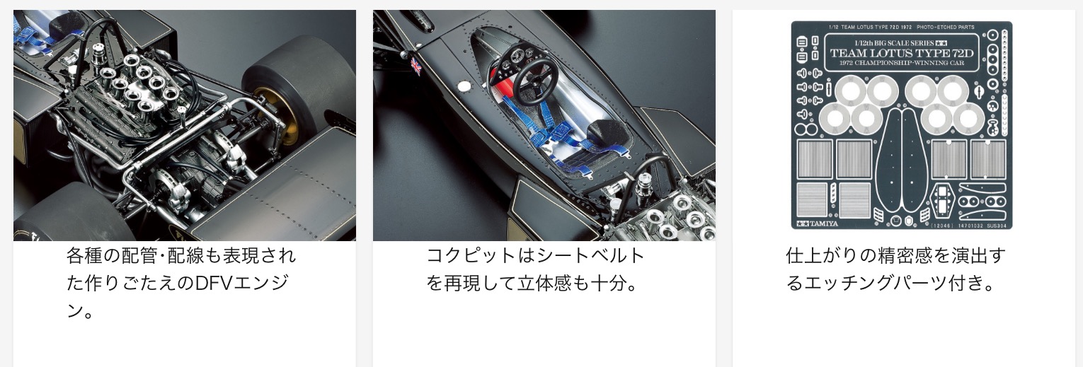●1972年、チーム ロータスとE.フィッティパルディにチャンピオンをもたらしたロータス タイプ72Dを1/12スケールで再現したプラスチックモデル組み立てキットです。