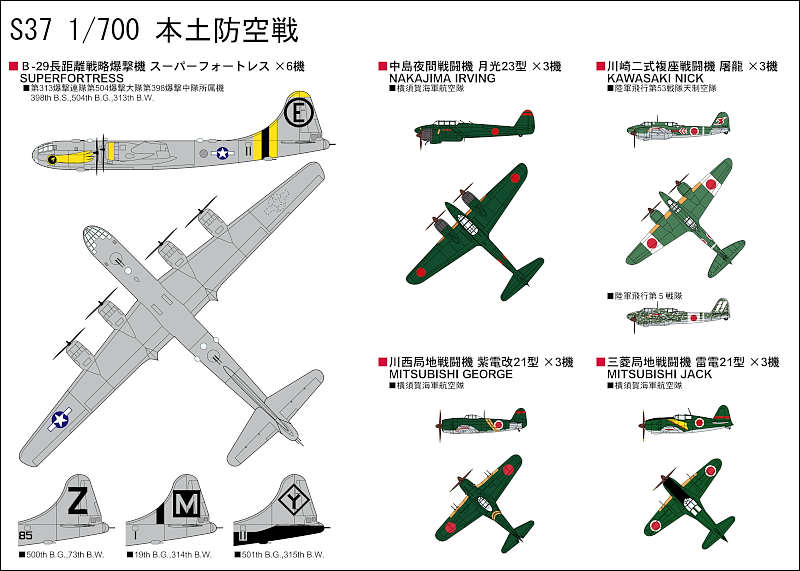 ・川西「紫電改」、川崎「屠龍」、中島 「月光23型」、三菱「雷電21型」×各3機入り