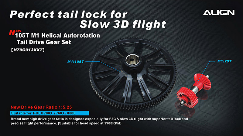 ●T-REX 700X / 760X / 800Eに使用してください。 ●新しい高駆動ギア比は、特にF3C&低速3D飛行のために設計されており、優れたテールロックと正確な飛行性能を備えています。(1900RPMのヘッドスピードに最適) ●最良の効果を得るためには、セット全体で使用する必要があります。 ●ギア比1:5.25