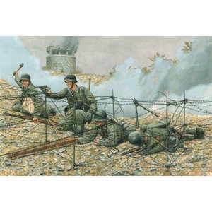 寝そべってワイヤーカッターを手に鉄条網を切る兵士、伏せて鉄条網を爆破するために「爆破筒」をセットする兵士、作業を援護するために手榴弾を投擲しようとしている兵士、そして立膝でP-08ピストルを手に射撃する指揮官の4体。 緊迫した場面を仕上げていただけるポーズです。
