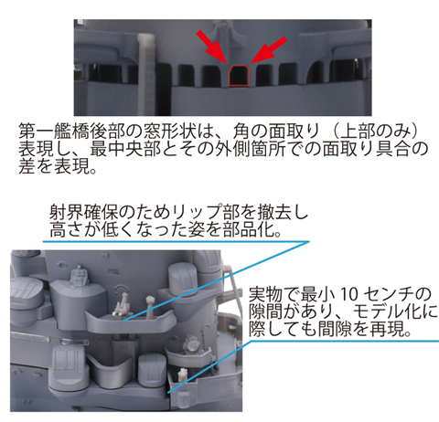 ・信号所甲板と3/4番探照灯管制器の間には実物で最小10センチの隙間があり、モデル化に際しても間隙を再現。