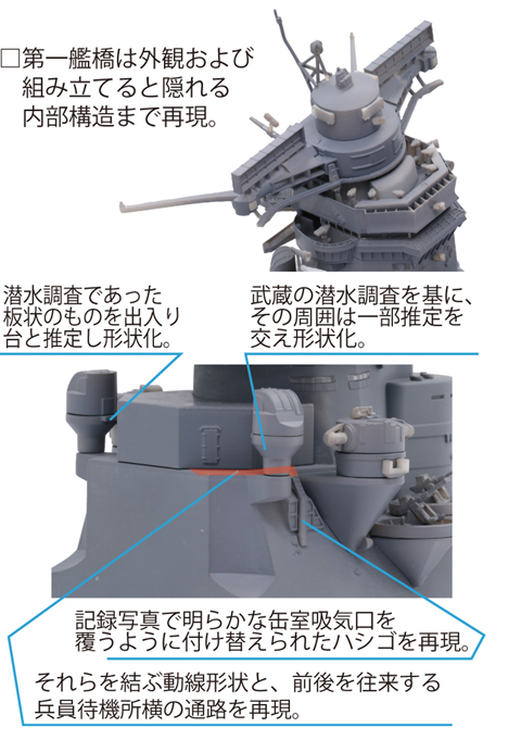 ・防空指揮所の前縁には、武蔵海底調査で明らかになった覆いを再現。接着が必要なボーナスパーツとして収録。