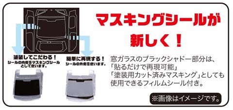 ・窓ガラスのブラックシャドー部分は、「貼るだけで再現可能」「塗装用カット済みマスキング」としても使用できる窓フィルム付き。