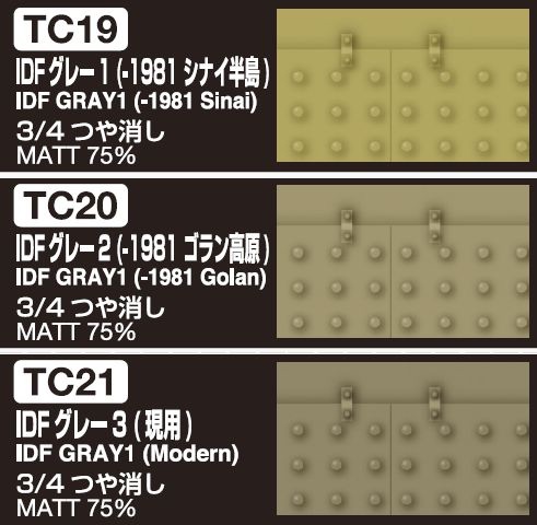 このセットでは、イスラエル国防軍(IDF)で運用される軍用車輌の塗装色、これまで調色再現の難しい色とされていた、「シナイグレー」とも呼ばれる迷彩色を、MENG MODELの資料提供により完全再現。