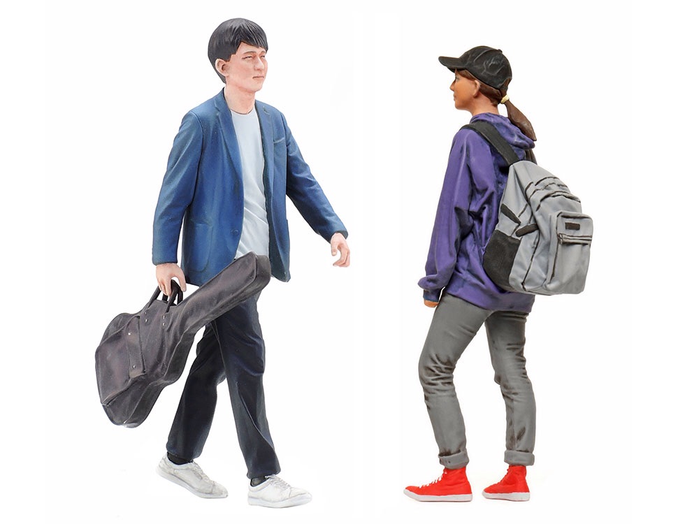 キャンパスライフを楽しんでいる和やかなムードいっぱいの人形セットです。スマートフォンで自撮りする二人組の女性、大型のリュックを背負った女性、歩いている男性、そしてヘルメットをかかえてスクーターに腰掛ける女性の5人を再現。最新の3Dスキャニングを駆使して立体化し、自然なプロポーションと細部にわたる繊細な表現、衣類のシワや各種アクセサリーの素材感までもリアルにモデル化しました。さらに、丸みのあるファッショナブルなフォルムで女性の人気も高いスクーター、ヤマハ ビーノもセット。1/24スケールのカーモデルとの組み合わせはベストマッチ。臨場感たっぷりの情景アイデアが広がるのはもちろん、人形だけでも楽しさあふれる爽やかなワンシーンが作れます。