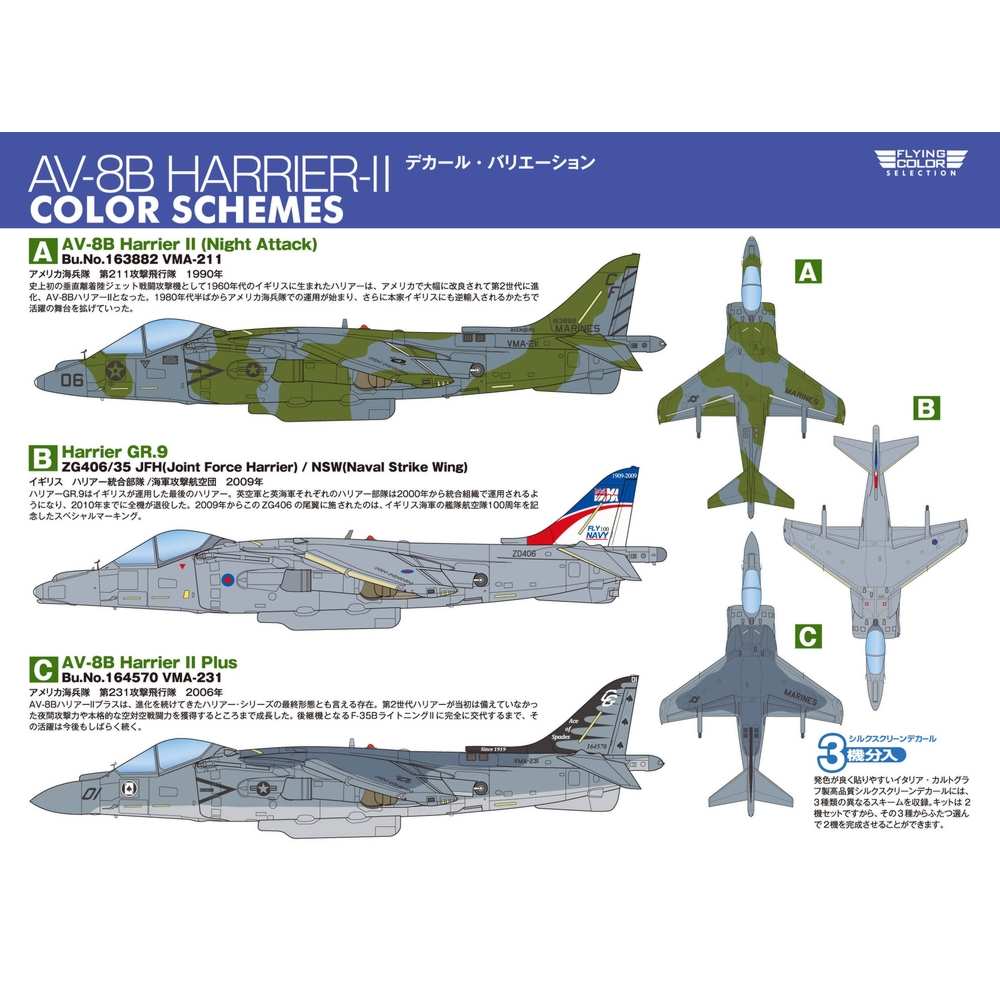 史上初の垂直離着陸戦闘攻撃機ハリアー、その第2世代であるAV-8Bシリーズの2機セットです。エフトイズ製パーツを使用するキットは、夜間攻撃能力が加わったAV-8B(NA)と、イギリス仕様のGR.9、そして最終進化型ともいうべきAV-8BハリアーIIプラスを選んで組み立て可能。VSTOL機ならではの「独自色」をお楽しみいただけます。