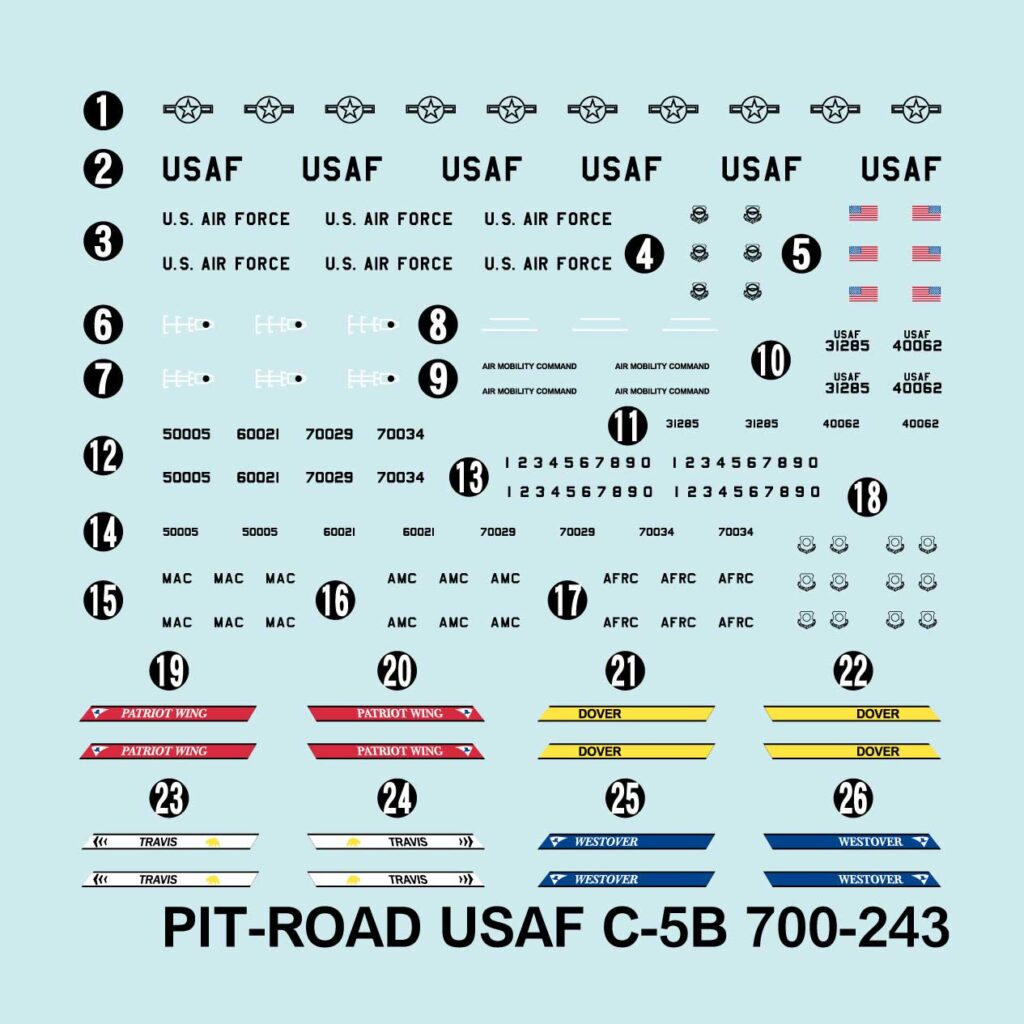 ・付属デカール:ドーバー、トラヴィス等アメリカ空軍航空機動軍団(AMC)3種、 空軍予備役軍団(AFRC)1種