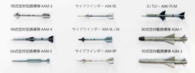 セット内容は、90式空対空誘導弾(AAM-3)、99式空対空誘導弾(AAM-4)、04式空対空誘導弾(AAM-5)、スパロー(AIM-7F)、サイドワインダー(AIM-9E、AIM-9L/M、AIM-9P)、80式空対艦誘導弾(ASM-1)、93式空対艦誘導弾(ASM-2) 以上、9種が各4基計36基入っています。