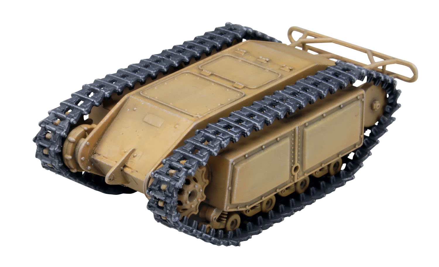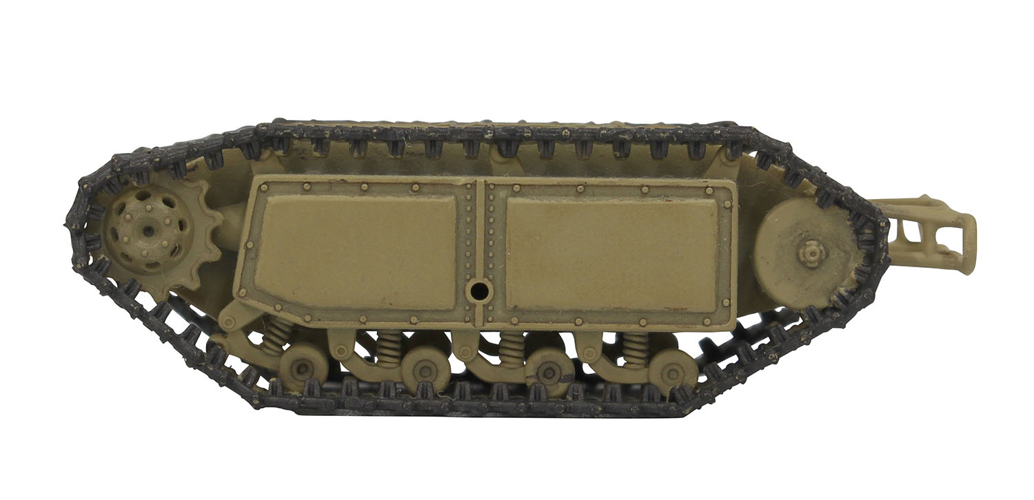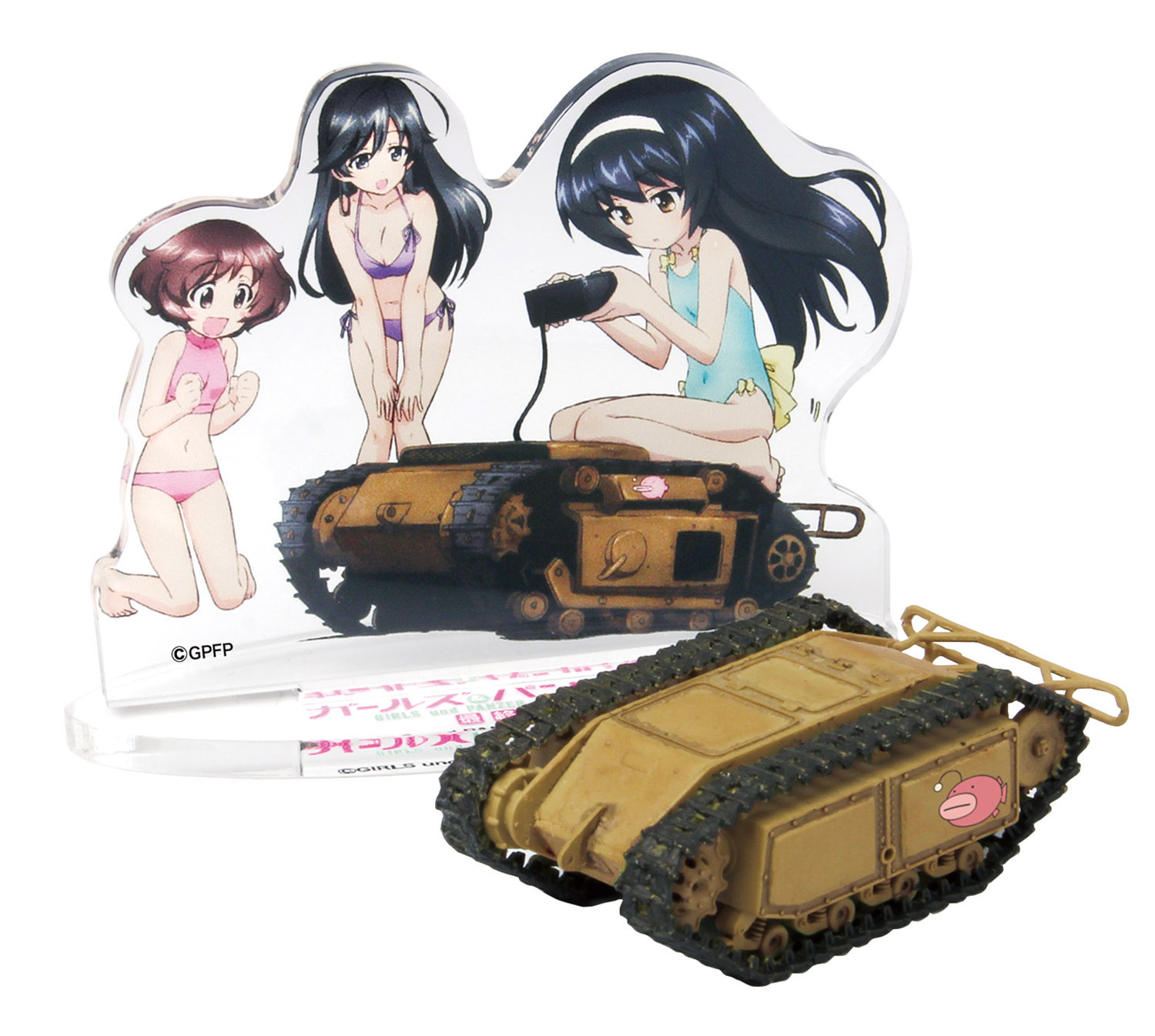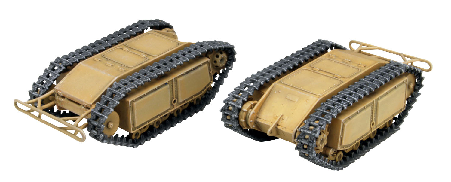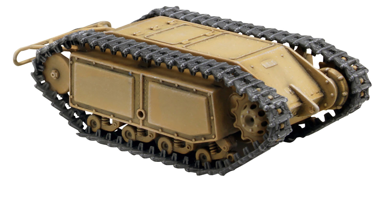 モデルは大洗女子学園の生徒会が新たな戦車を探すために使用した小さな車両、ゴリアテを1/35スケールで再現したプラスチックモデル組立キットです。第1話に登場したのと同じSd.Kfz.302のEモーター駆動タイプを再現しています。仕上がりの全長は約4cm、幅が約2cm。キットには2両分のキットが入っています。並んで走行していくシーンの雰囲気も再現していただけます。 小さい車両だけに部品点数も少なく、組み立ても手軽です。車体形状はもちろん、パネルラインやボルトなどのディテールもしっかりとモデル化。小さくても存在感ある仕上がりのモデルです。 加えてこのキットには完成モデルと一緒に飾って楽しめるキャラクターのイラストが印刷されたアクリルスタンドフィギュアもボーナスでセット。ガルパンファンには見逃せないキットです。