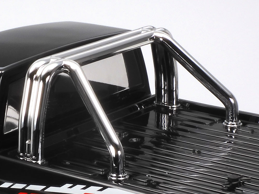 【 悪路走行が楽しみな、トラックユニット装着のピックアップトラック 】 前後のタイヤに換えてデルタ(三角)形状のトラック(クローラー)ユニットを車軸に装着したピックアップトラックの電動ラジオコントロールカー組み立てキットです。シャーシはシャフトドライブ4WDのTT-02がベース。注目のトラックユニットは金属ピンを使用した連結組み立て式の樹脂製トラック(クローラー)を採用し、ドライブシャフトに連結してパワーを伝えるスプロケットホイールと8個のローラーで構成。タイヤに比べて接地面積が広く、優れた登坂性能はもちろん雪原や砂浜、泥道などの悪路でもスタックしにくく、安定したグリップ力を発揮します。さらに、防塵用のポリカーボネート製シャーシカバーとフロントインナーフェンダーを装備して、走りの信頼性を高めました。ボディは80年代のピックアップトラックをイメージしたポリカーボネート製。本体をブラック、ウインドウはスモークで塗り分け、ホイールアーチのカット加工を施しました。また、フォグランプを装備したグリルガードとロールバーをメッキ部品として、スケール感も十分です。