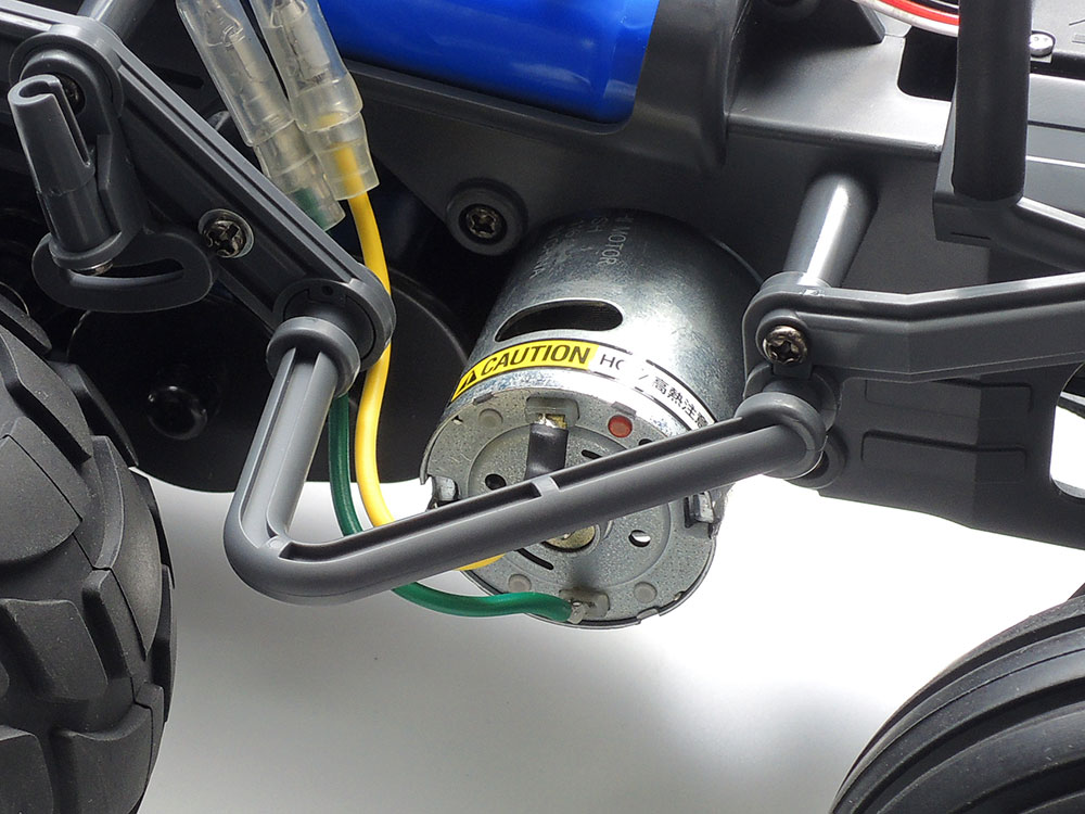 【 走る面白さを詰め込んだ後輪駆動のWR-02CBシャーシ 】 シャーシは後輪駆動のWR-02をベースにしたWR-02CBを採用。モーターやバッテリーの搭載位置を工夫することで、走らせやすく、簡単にウイリーさせることができ、オンロードからオフロードまで走る場所を選びません。また、組み立てが少し面倒なギヤケースは、モーターを取り付けた状態で完成しているのもポイントです。足まわりはロングサスアームにCVAオイルダンパーを装着して、荒れたオフロードでも安定した走りが可能です。また、シャーシ側面には万一の転倒からモーターを守り、バギーらしさを引き出すサイドガードをセット。後部に取り付けられたウイリーバーは、ウイリーした時の転倒を防ぐだけでなく、取り付け角度を変えてウイリー走行の調整も可能です。さらに、ボディカラーに合わせた、ホワイトとピンクのカラフルな組み合わせが目を引くホイールは2ピース構造。タイヤはフロントに直進安定性の高いリブパターン、リヤにグリップ力のあるラウンドブロックを装着してコミカルムードを高めました。