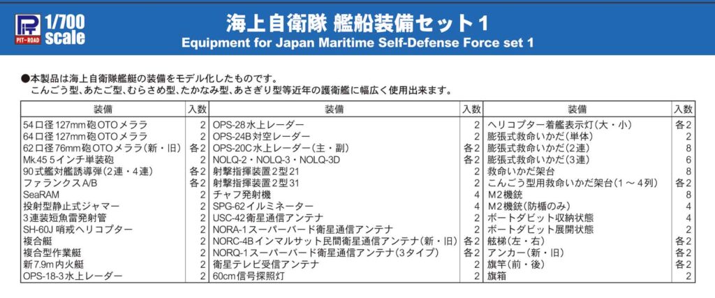 1/700スケール 新・艦船装備セットに海上自衛隊の装備が加わります。こんごう型、あたご型、むらさめ型、たかなみ型、あさぎり型等近年の護衛艦に幅広く使用可能なパーツセットです。