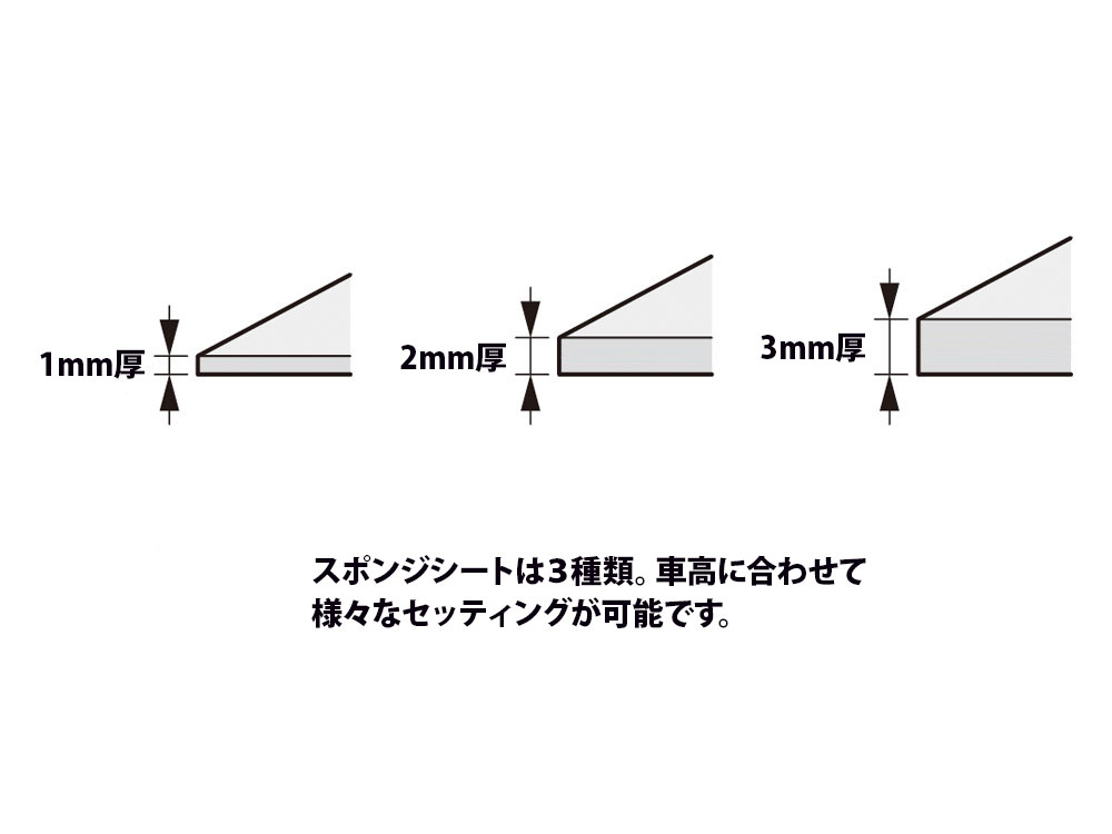 ブレーキ効果の高いスポンジシートのセットです。1mm、2mm、3mmの3種類の厚みを用意。1mm厚はシャーシ下面などの隙間の小さい場所にも貼り付けOK。厚さの違うスポンジシートを様々に貼ってブレーキセッティングが可能です。