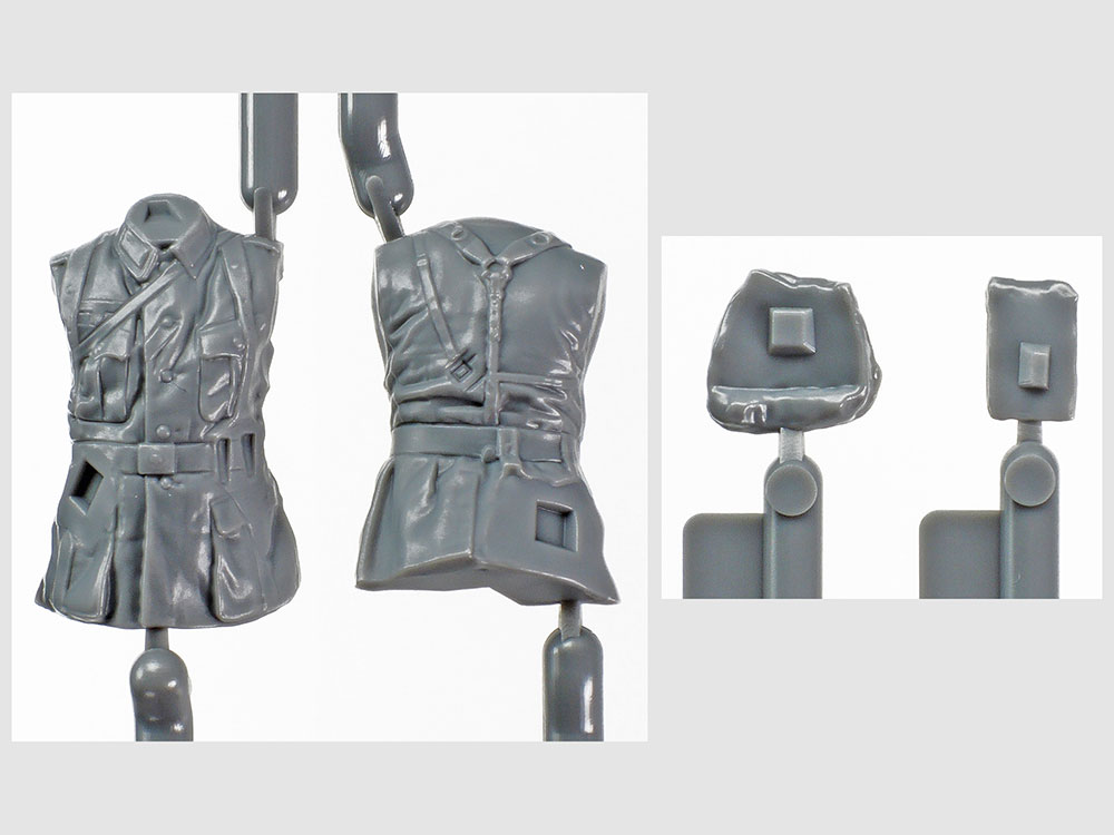 第二次大戦中期のドイツ軍兵士は、主にフィールドグレイの服地に襟が濃緑色のM36野戦服を着用。また、襟を服地と同色のフィールドグレイに変更するなど、M36を一部簡略化したM40野戦服姿も見られました。これらにヘルメットや略帽、ジャックブーツを合わせ、多くの兵士がY字型のサスペンダーを装着。雑のうや水筒、スコップなどを身に付けていました。また、武装は兵卒がKar98kライフルやMG34機関銃、下士官はMP40短機関銃を装備し、下士官や機関銃手は護身用の拳銃も携行。他国とは一線を画す、洗練された装備に身を包む歩兵たちを実感豊かに再現しました。