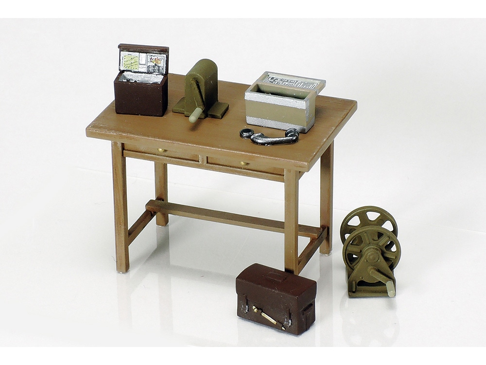 ●将校用軍刀やホルスター、図のう、双眼鏡ケースなどの個人装備品もリアルに再現。 ●机や椅子、野戦電話機とカバン、電話線のリール、小型無線機と発電機、歩兵砲の薬莢木箱などアクセサリーも豊富にセット。