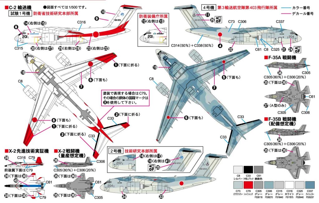 心神とも呼ばれた実証機X-2、最新鋭次期戦闘機F-35Aと派生STOVL型F-35B、C-1の後継機として運用が始まった最新輸送機C-2のセットです。