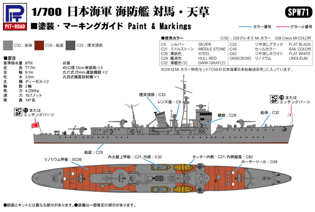 ・旗、旗竿のカラーエッチングパーツ(旗は手で曲げることによって風になびく様を再現できます)、「対馬」「天草」艦名プレート付属。