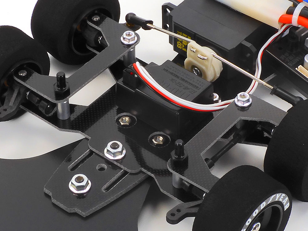 【 スケール感の高いプラボディが魅力の6輪マシン 】 前輪を4輪とした6輪車という奇抜なアイデアを採用して1976年のF1に参戦。第7戦スウェーデンGPでは1、2フィニッシュをとげるなど、奇抜なだけではない高いポテンシャルを証明したF1史上唯一の6輪マシンがタイレルP34です。翌1977年の開幕戦、アルゼンチンGPに投入されたマシンはエアロダイナミクスに優れたフルカウルを採用し、ファーストナショナルシティ銀行をメインスポンサーとしたブルー&ホワイトのカラーリングに変更。このアルゼンチンGP仕様のタイレルP34を再現した電動ラジオコントロールカーの組み立てキットです。フルカウルボディはスケール感の高い耐衝撃プラスチック製。カウル上部はホワイト、サイドポンツーン部分はブルーパーツ。ステッカーはR.ピーターソンの3号車、P.デパイユの4号車用に加え、タイヤ用のGOOD YEARロゴもセット。ステッカーを貼るだけでボディが仕上げられる手軽さもうれしいポイントです。 【 6輪仕様の専用シャーシで走りも楽しみ 】 シャーシは高効率のダイレクトドライブ2WD、F103をベースに6輪仕様にモディファイした専用タイプ。アッパー1.5mm、ロワ2.5mm厚のFRPで構成された軽量・シンプルなハーフダブルデッキフレームを採用し、フロントは一体型ロワアームと左右別体型アッパーアームで構成された、キングピン・コイルスプリングによる4輪独立サスペンション。1つのサーボで4輪をステアリングします。リヤはFRP製Tバーのしなりをコイルスプリングとローフリクションパッドで制御するリジッドタイプ。スパーギヤにはリミテッドスリップ効果を発揮するボールデフを内蔵。さらに、軽くグリップ力に優れたスポンジタイヤを前後輪に装着。独特な走り味が楽しいモデルです。