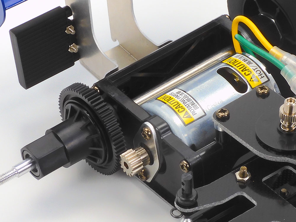 【 基本スペック 】●全長435mm、全幅200mm、全高108mm、車体重量800g(RCメカ、バッテリー含まず)。 ●トレッド=F:140mm R:155mm ●タイヤ幅/径=F:23/44mm R:45/64mm ●フレーム=FRP製ハーフダブルデッキ ●駆動方式=横置きモーターリヤダイレクトドライブ2WD ●デフギヤ=ボールデフ ●ステアリング=等長2分割タイロッド式 ●サスペンション=F:キングピン・コイルスプリング R:Tバーリジッド ●ギヤ比=4.5:1(14Tピニオン/63Tスパーギヤ使用) ●モーター=RS-540SH ●スピードコントローラー=ESC仕様(別売)
