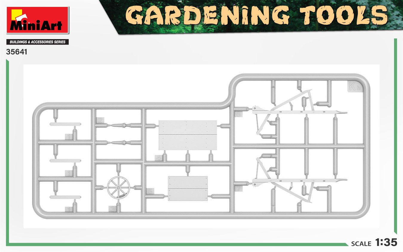 パッケージに描かれている柵、机、鎌、ショベル、バケツ、一輪車などのセットです。