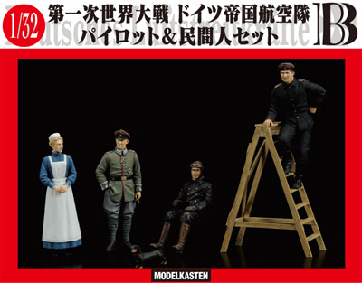 竹 一郎氏が原型を製作、『隔月刊スケールアヴィエーション』誌上にて発表された、WW I 当時のドイツ空軍パイロットと民間人をセットにしてプラスチックキット化いたしました。Bセットはパイロット(下士官、着座姿勢)と梯子に登った地上員、 看護婦に加えてダックスフント一頭の4体+1頭という組み合わせ。着座姿勢のパイロットは飛行帽の形状が異なる頭部が2種セットされ、好みで使い分けることができます。単品でも、お手持ちの複葉機のアクセサリーとしても楽しめる汎用性の高いキットです。 ●この商品はプラスチック製の組み立てキットです。キットは塗装されていません。プラスチックモデル専用の接着剤および塗料は、別途お買い求めください。