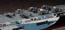 船体は左右分割式で、内部に桁を挟み込む事で 組み立て易さと高い安定性を実現。 甲板は2枚分割式。下面の桁ごと船体にかぶせる構造。 甲板表面の彫刻は非常に細かく繊細に入っています。 艦載機はアベンジャー×3機、ワイルドキャット×6機をセット。 (主翼は展開状態/折りたたみ状態の選択式で、キャノピーは透明部品) 展示用スタンドが付属。