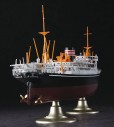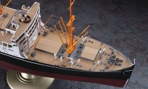 キットは、戦前の日本郵船所属時代を完全新金型で再現します。 船体は内部に桁を挟み込むことにより、確実な組立と強度を実現。 客室まわりにつきましては、開口部などから見える外観部分は、しっかりと作り込んでいます。 甲板は水はけを良くするために湾曲させている 断面形状(キャンバー)も正確に再現。 船橋の窓や、探照灯は透明部品をセット。 展示用スタンドが付属。 貨客船の特徴の一つとも言える、 多数のクレーン(デリック)と、 そのウインチも 精密にパーツ化しています。 戦艦や空母とは全く異なるパーツ構成と存在感をお楽しみいただけます。