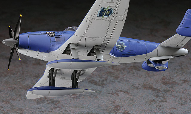 本機の特徴であるフロートは、展開した「水上機」の状態 と、収納した「飛行状態」の選択式。クリアー成形の専用のスタンドが付属しますので、飛行状態での展示も可能です。