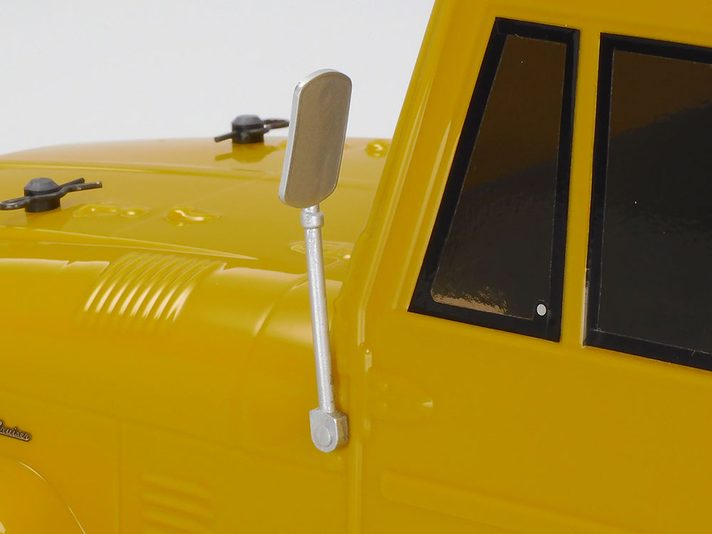 【 クロカン走行も楽しみなシャフト4WD、CC-02シャーシを採用 】 シャーシは実車ライクなラダーフレーム形状を採用したシャフトドライブ4WDのCC-02。フレームの前後に金属製サブフレームを装備して高い剛性と実感を両立しました。モーターはフロントアクスル後部に縦置きし、ギヤボックスとトランスファーケースをセパレートタイプとして、プロペラシャフトで前後に駆動力を伝達。幅広いギヤ比が選択でき、スムーズなパワー伝達に加えて、形状も実車感を追求しました。サスペンションは樹脂製アクスルハウジングをCVAオイルダンパーと4本のリンクで位置決めする、前後4リンクリジッド。シンプルな構成で強度が高く、最低地上高が変化しにくいためオフロード走行に適し、繊細なコントロールが要求されるロックセクションも楽しめます。また、シルバーの12本スポークのディープリムホイールには高い悪路走破性が魅力のブロックパターンタイヤを装着しました。