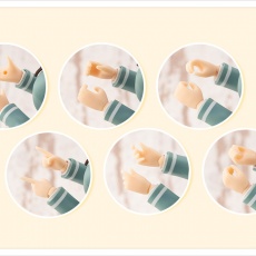 【全部で13種類の手首パーツ】 よりポージングの幅を広げるためにいろんな表情の手首パーツを用意しました。 夏服に付属した7種類に加えて完全新規の「ピースA」「ピースB」「〇印」「指さしB」「いじいじ」「両手でハート」の6種類です。 指さしBはアイドルのようなポーズに役立つこと間違いなしです。 【4種類の表情パーツ】 冬服には「微笑み顔」「ジト目顔」「照れ顔」「泣き顔」の4種類が付属。 夏服にはなかったしおらしい表情をラインナップしました。ぜひ夏服と組み合わせて遊んでください。