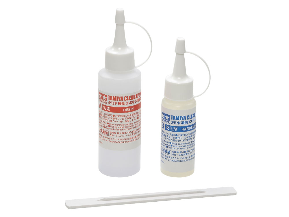 スケールモデルの情景作品や鉄道模型のレイアウトなどに、「水辺」を再現するのに最適な、透明度が高く黄変しにくいエポキシ樹脂です。主剤と硬化剤を2:1の割合で混ぜ、約24時間で完全硬化。粘度が低く型などへ注入するのも簡単です。スイーツデコレーションのゼリー、キャンディ、ジュースなどの素材、ペンダントやブローチなど透明アクセサリー作品などにも便利に使えます。タミヤカラー・エナメル塗料を混ぜて着色する事も可能。使いやすいノズル付きボトル仕様。かき混ぜ棒もセットしました。