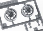 新規プラ部品のフロント下部(スリットが無いタイプ)と、 スチールホイール部品をセットします。 ボディパーツカラーはシルバー。 窓の塗り分けシールが付属。