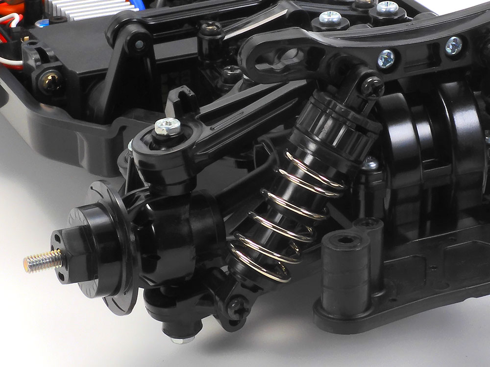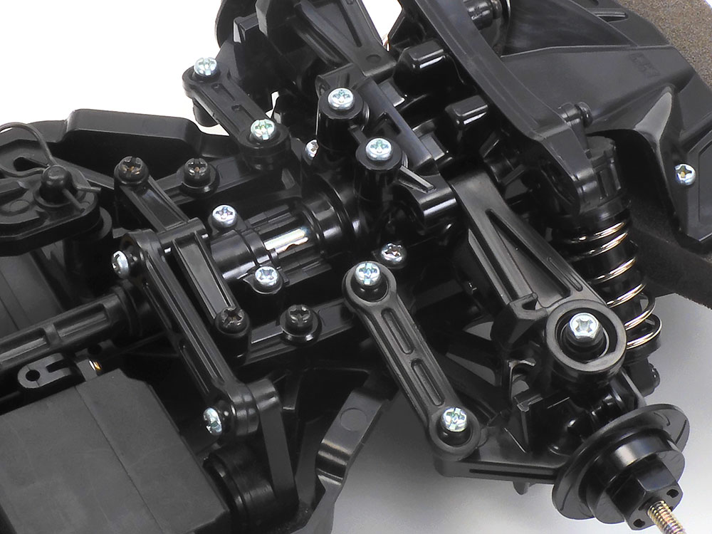 【 操縦性に優れ、セッティングも楽しいシャフトドライブ4WDのTT-02シャーシ 】 シャーシはシャフトドライブ4WDのTT-02を採用。走行用バッテリーを左、モーターを右に縦置きにレイアウトした好バランス設計により操縦安定性に優れ、サスアームやアップライトを左右共通化して組み立てやすく、上下分割式のギヤケースなどにより整備性も高い構成となっています。さらに、パーツの組み換えなどによりホイールベース、車高、トレッドがそれぞれ2種類選べ、10種類の幅広いギヤ比が選択できるモーターマウントなどセッティングも楽しめます。また、ホイールハブはブレーキディスク風のデザイン、バンパーには実車のレーシングカートをイメージしたバンパーサポートを装備するなど、遊び心もたっぷり。ダークガンメタルカラーのフィンデザインホイールに、レーシングラジアルタイヤを装着して足もとを引き締めました。 【 基本スペック 】
