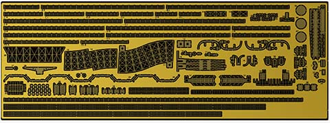 艦載機の成型色は作業性を考慮したグレー成型。 インジェクションパーツでは再現の難しい、細部に至るまで表現できるエッチングパーツを収録。 エッチングパーツは、手摺、梯子、クレーン、ボートダビットなどを収録しています。
