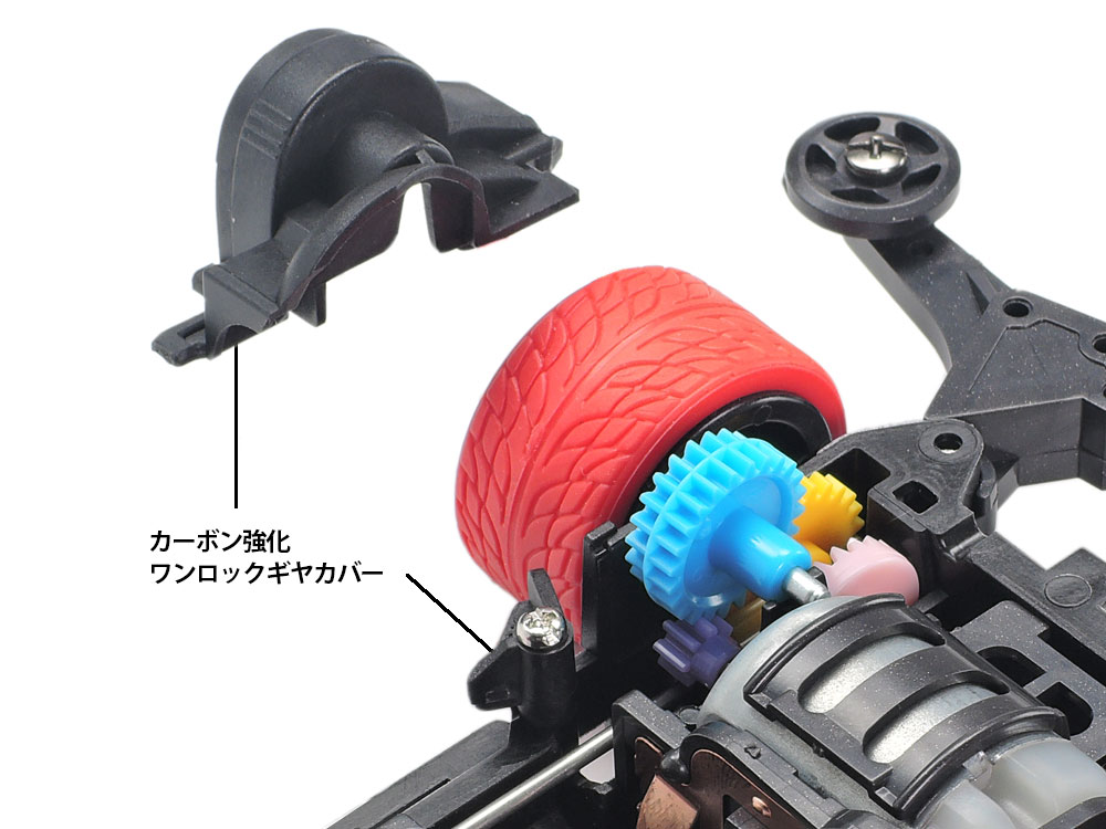 【 スーパーIIシャーシ 】 シャーシはレースでも使われて人気の高いスーパーIIを採用。本体はブラックのカーボン繊維配合ナイロン樹脂製。ABS樹脂製のAパーツはメタリックグレイでカラーリングしてメカニカルに仕上げました。また、ターン式スイッチ、2点固定式リヤステーなど走りのための装備も充実。バンパーやリヤステーはパーツ取り付け穴を複数用意して幅広いセッティングに対応します。ギヤ比は3.5:1をセットしました。