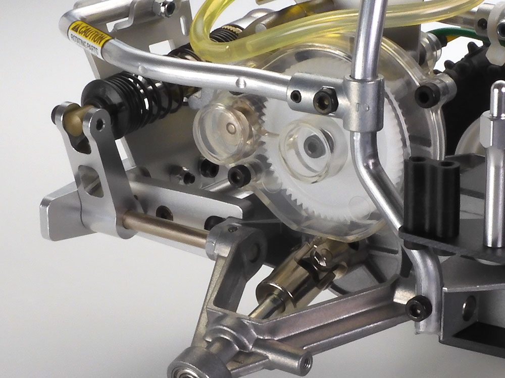 【 実車ムードたっぷりのシャーシ構成 】 2mm厚FRP板とジュラルミン板で構成されていたメインフレームは2.5mm厚FRPに変更し、1.5mm厚のメカデッキと共に精悍なブラック仕様。メカデッキの下にはコンパクトな LF1100-6.6Vレーシングパック(Mサイズ)(別売)を搭載します。ダイキャスト製アームを使用した前後のサスペンションは当時のまま。特徴的なリザーブタンク付のダンパーを装備したリヤサスペンションは、新設計部品で再現し精度を高めています。また、モーターまでフルカバーしたギヤボックスはノンデフ仕様、高いトラクション性能を生み出します。タイヤは前輪が方向安定性の良いリブパターン、後輪はショルダー部にまでスパイクを回り込ませたスパイクタイプ。ホイールは前後ともタイヤをがっちりとホールドする3ピースを採用。実感あふれるオフロード走行がたっぷり楽しめます。