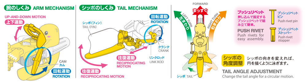 【 泳ぐラッコのかわいいしぐさに夢中! 】 お腹の上にのせた貝をカチカチとたたきながら泳ぐ、かわいいラッコの工作セットです。背中につけた水中モーターの回転をギヤボックスでスピードダウン。シッポを左右に振ってゆったり泳ぎます。また、本物のラッコそっくりに腕を上下させて貝をたたく動きはカム機構、しっぽに合わせて足をゆらゆらと振る動きはリンク機構を使って表現。実際に組み立てて動かすことで、モーターの回転運動が往復運動に変わるしくみがよく分かります。さらに、シッポの角度を調整して右回り・左回りにぐるっと旋回もOK。シッポや足などは押し込むだけで固定できる「プッシュリベット」を使っていて、ビス止め作業はほんの少しなので、はじめて工作シリーズにトライするお子さんにもぴったりです。そして、かわいらしさを引き立てる目や鼻、貝などの耐水ステッカーもセット。元気いっぱいに水面を泳ぐ、愛きょうたっぷりの姿に夢中になることうけあいです。