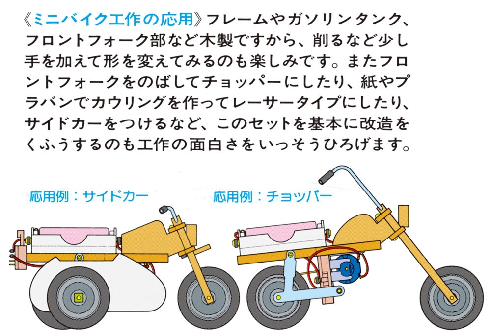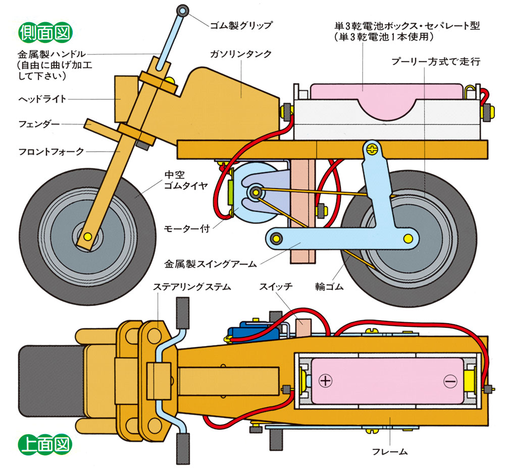 【 軽快なミニバイクの走りが楽しめる工作セットです 】 実車そのままのメカニズムで走るミニバイクの組み立て工作キットです。走るしくみはプーリーを使用。モーターシャフトとリヤホイール側面のプーリーに輪ゴムをかけてモーターの力を後輪に伝えます。木製のフレームやタンク、フェンダーなどはカット加工ずみで、ビス用の下穴もあいています。またモーターはマウントへはめ込むだけ、配線もコードをつなぐだけの手軽さですから組み上がりも確実です。幅が広く走行性能のいい中空スリックタイヤで安定した2輪走行が楽しめます。